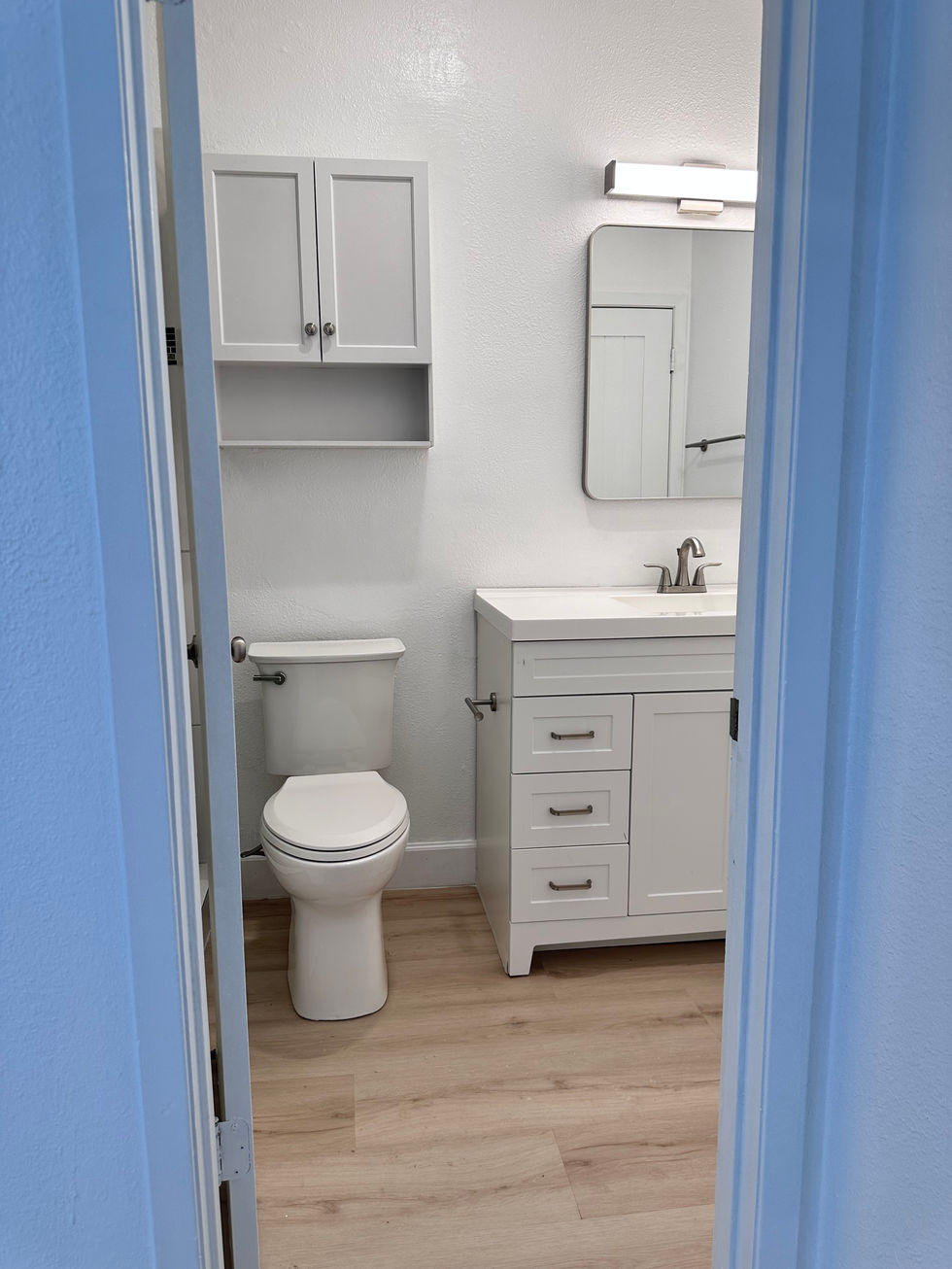 For flooring we used a Vesinet Oak luxury plank paired with 5 1/4 inch baseboards to really open the space up. We painted walls and ceilings a bright white to again make the space feel larger than the square footage allows. For countertops we went with a Calcutta grey quartz to complete the new island top, we installed a new double stainless steel 18 gauge sink with new faucet. For hardware we kept it consistent with the brushed nickel theme. The backsplash is a marble iceberg hexagon pattern with an avalanche grout that compliments the countertops and new shaker cabinets. We went with a bold move for the fireplace by stuccoing over the stone, painting the stucco and adding a scraped wood mantel and I can say it really came out well! In the bathroom with installed a frameless shower glass, cabinets, and new vanity with quartz top, we also installed a new door for laundry along with all new accessories.